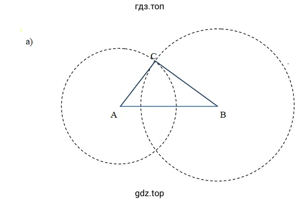 - Точка пересечения двух дуг является третьей вершиной треугольника, обозначим ее буквой C. Эта точка удовлетворяет обоим условиям: она удалена от A на 3 см и от B на 4 см. (Обычно получается две точки пересечения, можно выбрать любую из них).