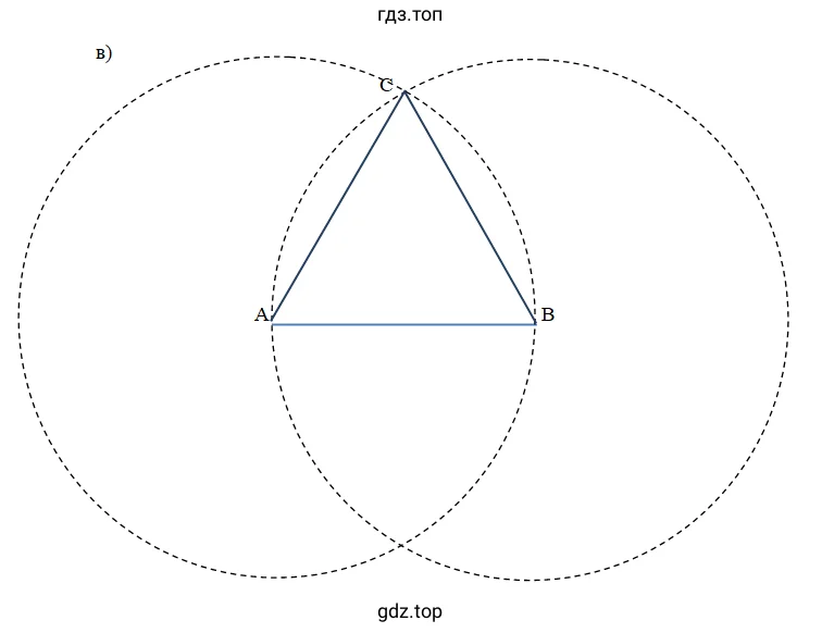 Ответ: Построение выполняется по алгоритму: чертим отрезок AB=6 см, затем проводим две дуги радиусом 6 см из центров A и B до их пересечения в точке C, после чего соединяем вершины A, B и C.