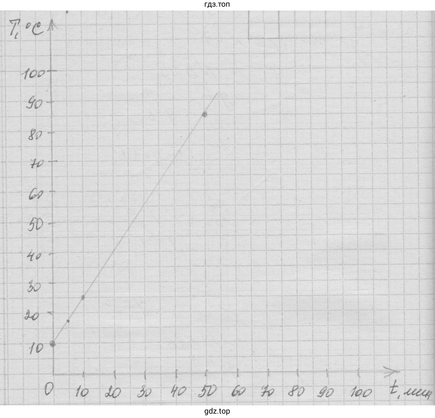 Аналогично, для времени 10 минут находим на оси t значение 10. По графику соответствующая температура равна $25^{\circ}\text{С}$. Проверка по формуле: $T(10) = 10 + 1,5 \cdot 10 = 10 + 15 = 25^{\circ}\text{С}$.